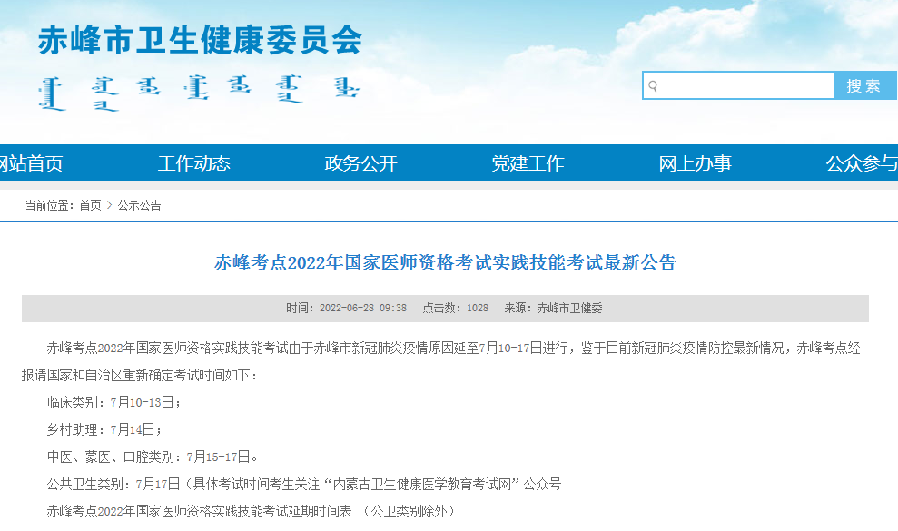 赤峰考点2022年国家医师资格实践技能考试由于赤峰市新冠肺炎疫情原因延至7月10—17日进行,鉴于目前新冠肺炎疫情防控最新情况,赤峰考点经报请国家和自治区重新确定考试时间如下:
