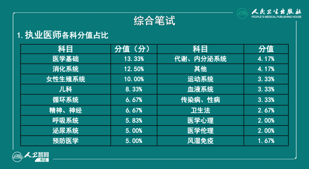 消化系统、女性生殖系统、儿科疾病、呼吸系统、心血管系统、精神神经系统这几个科目,约占医师资格考试近一半的分值,临床科目中的三大系统分别为消化系统、女性生殖系统和儿科疾病,是医师资格考试的TOP3,所以想要摘取高分就要吃透这个三个系统。